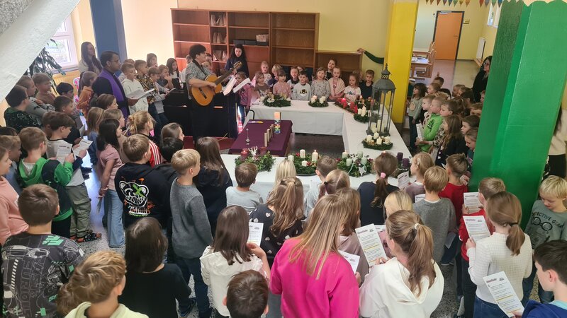 Die Kinder gestalteten die Feier mit Liedern, Fürbitten und Gedanken zum Advent. Der Pfarrer segnete anschließend die Adventkränze aller Klassen, die nun in den Klassenräumen die Vorfreude auf Weihnachten sichtbar machen.